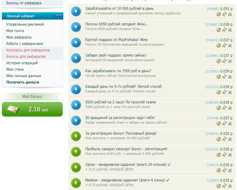 Арифметика простая 20 объявлений по 3,5 копейки на 10 сайтах это уже 7 рублей за одно посещение. Прибавить сюда письма, пусть по три письма по 5 копеек в среднем = ещё 1,5р. За месяц в лёгкую 250р. Только с кликов. А если у вас куча времени, можете зайти покликать несколько раз в день. Тогда у вас будет не 25 кликов а к примеру 75 кликов в день. Соответственно за месяц будет получаться около 1000р. Справедливости ради, замечу что с ростом цен в магазинах растут и ставки на сёрфинге. Например, некоторые клики чаще стали оцениваться по 4, 5 и до 8 копеек.