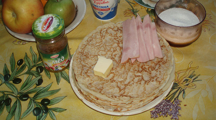 Блинчики я пеку тоненькие, как бумажный лист. А уж начинку каждый сам себе выбирает. Внуки (мальчики) любят блины с творожной сладкой с изюмом массой. А внучка больше любит со сметаной. Муж блины ест с мёдом, а сыновья с мясом. Вариантов полакомиться блинами множество, успевай только со сковороды снимать...