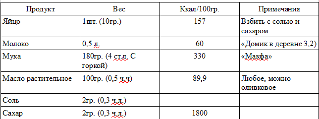 С такого расклада получается примерно 20-23 блина. Количество блинов зависит от размера сковороды и объёма ложки которой разливается блин. У меня сковорода «Цептер» 20см. И половник на 23гр. Таким образом путём не хитрых арифметических подсчётов 1 блин весом примерно 38гр. Содержит около 15 кал. Лично я при своём весе 55кг. Могу съесть не больше 5-ти блинов.